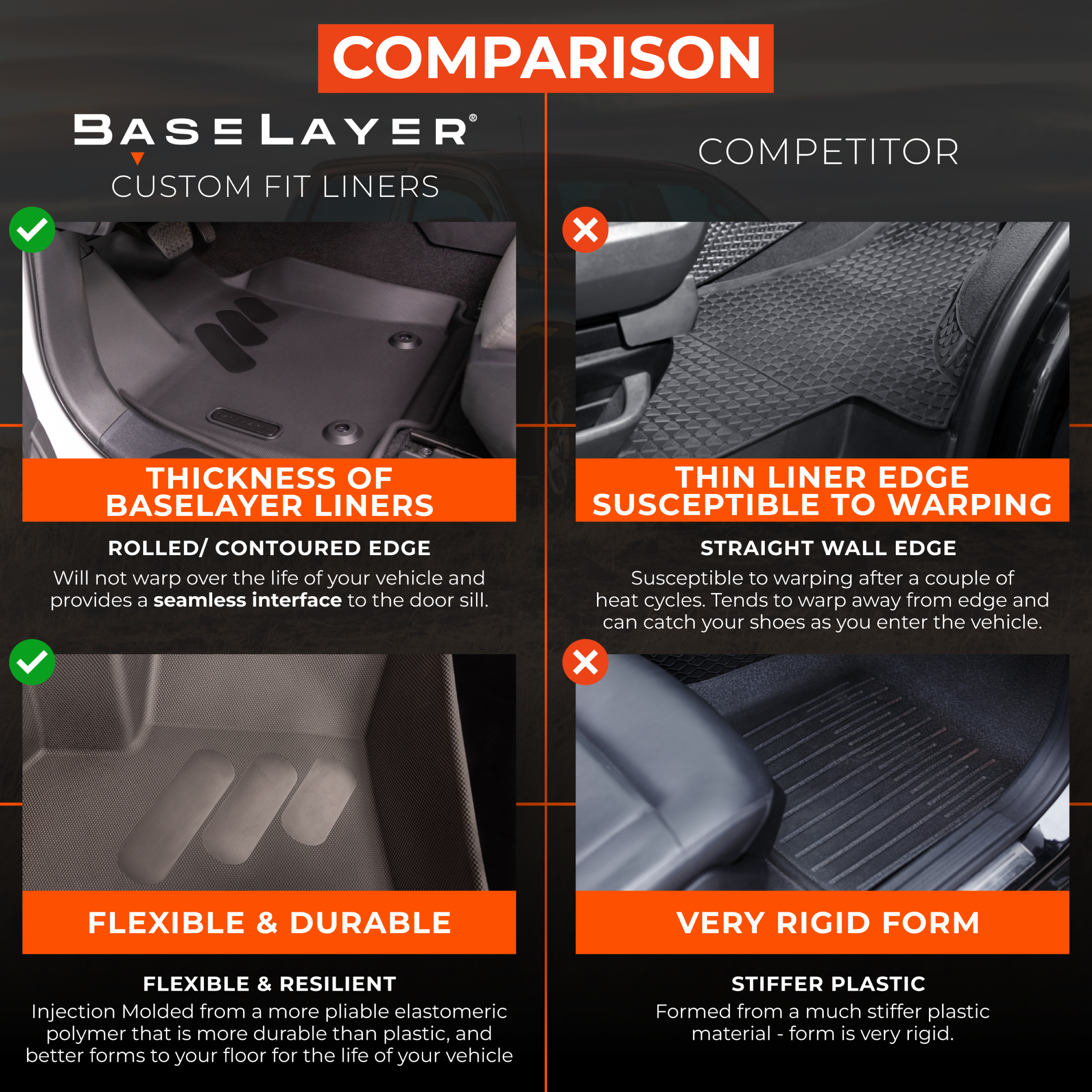 - UNCOMPROMISING MATERIAL INTEGRITY: Made in the USA, crafted from injection-molded TPE, BaseLayer mats feature a heavier weight profile, reinforced heel pads, and a soft yet resilient texture that conforms effortlessly to your vehicle’s floor